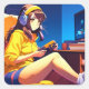 Menina de anime bonito vestindo fones de ouvido em amarelo.