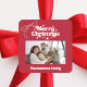 A red background, white text and a hand-drawn bow. Text and photo. Merry Christmas is written with a retro style font.