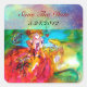Caráter mascarada veneziano colorido, caprichoso e vibrante. Uma loura sofisticada e bonita está sentada com uma rosa vermelha e uma máscara de penas na mão com tecidos espumantes de ouro, de um figurino barroco mascarado, com penas e um cachorro. Pintura em aquarela com cores brilhantes, cor-de-rosa amarela, verde, faíscas douradas e folha prateada, inspirada em personagens da Comédia de Arte ( Commedia dell' Arte ), Carnaval de Veneza e máscaras de penas venezianas. Este design legal e artístico é também um belo presente para ocasiões especiais, aniversários, natal, Dia de os namorados, Mardi Gras ( Fat Terça ).