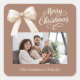 Um fundo de café mudo, texto colorido creme e um arco. Feliz Natal é escrito com uma elegante fonte estilo escrita à mão. Personalize e adicione seu nome de família.