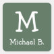 Adesivo quadrado arredondado com nome branco e monograma em verde com forma quadrada branca indefinida.
