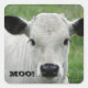 Uma vaca branca com ouvidos pretos, olhos, nariz e as pestanas mais compridas esvoaçam na câmera para tirar seu retrato.