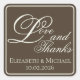 Express your gratitude with heartfelt style using this elegant Ivory Coffee Script "Love and Thanks" Square Wedding Sticker. The clean Ivory backdrop beautifully frames the large, flowing "Love and Thanks" script, rendered in the rich Coffee Romance typography. This square sticker is the perfect size for sealing thank-you card envelopes, or as a charming favor label on gift bags, boxes, or jars, featuring the couple's names and wedding date below. The combination of classic calligraphy and clean details maintains the minimalist, sophisticated aesthetic of your celebration, providing a warm and personalized final touch to your guest gifts.