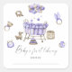 O convite mostra aquarela de um berço de bebê, um móvel de berçário em forma de nuvens redondas roxas, brinquedos infantis: um elefante roedor, um pato sobre rodas, um ursinho de pelúcia, um coelho, um babador, uma chupeta, uma pirâmide.
