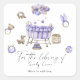 O convite mostra aquarela um berço de bebê, um móvel de berçário em forma de nuvens redondas roxas, brinquedos infantis: um elefante roedor, um pato sobre rodas, um ursinho de pelúcia, um coelho, um babador, uma chupeta, uma pirâmide.