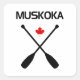 Mostra dois remos cruzados de canoa, uma folha vermelha de mapa canadense e "Muskoka" acima. Os remos e o texto são pretos. Evoque o excelente canadense ao ar livre. Design para pessoas que possuem uma cabana em Muskoka e/ou no lago Muskoka, para Ontarianos, Canadianos, turistas americanos, visitantes. Para pessoas que gostam da natureza, esportes aquáticos, canoagem, caiaque, remar, embarque, barco, navegação ou barco.