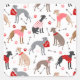Cães gregos italianos, Dias de os namorados, de raça branca, com casacos pretas, aventais, cinzas, vermelhos e castanhos a vestir a vermelho, cor-de-rosa, bolinhas branca e suéteres cardíacos com estampas de pata dispersas e padrão de flechas.
