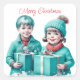 Crianças adoráveis, menino e menina, irmão e irmã em adesivos de Natal Alegre azul