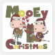 Duas vacas em bonés de meia, presentes do Natal, luzes do feriado, bastões de doces, e texto vermelhos que lê de "o Natal Mooey" em t-shirt do feriado, canecas, cartões, etiquetas, sacolas, pulsos de disparo de parede, caixas da lembrança, ornamento, chaveiro, e outros roupa e presentes bonitos do feriado do tema da vaca.