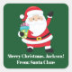 Vinheta de presente de Papai Noel verde personalizado para os presentes de Natal dos seus filhos. Personalize os presentes de férias dos seus filhos de e para com o seu nome personalizado sob o sorriso de Papa Noel em seu terno vermelho alegre.