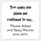 Demasiados morrem quando nós..Comprar Adote adesivos Spay/Neuter: a sobrepopulação de animais de estimação é um problema sério em todo o mundo. Partilha o coração ver cães, gatos e outros animais criados e vendidos em lojas de animais de estimação quando há tantos animais de estimação em abrigos de animais que precisam de casas? Quebra o coração para ver filhotes e gatinhos indesejados em nascer por causa de pessoas que não queriam se incomodar em pegar mama e papa cachorros, gatos e quaisquer outros animais mortos e castrados? Esta design é para você! O texto é "Muitas morrem quando continuamos a comprar... Por favor, Adote e Spay/Neuter seus animais de estimação."