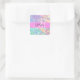 Cor rosa-menina, pêssego e nome do monograma holográfico iridescente e autocolante quadrado inicial. Seu nome personalizado e monograma são escritos em um elegante roteiro escrito à mão com um fundo rosa. Um aniversário perfeito ou presente de Natal!