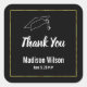 O adesivo é preto. Um boné de formatura branco está no topo. No centro, as palavras 'obrigado você' aparecem em um roteiro branco. Na parte inferior, você pode personalizar o adesivo com o nome do formando e a data da graduação ou a data da festa de formatura.