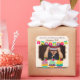 Celebre o aniversário de sua adorável criança de três anos com este design colorido: três cupcakes maravilhosos com velas e cerejas, belíssimos bunting de aniversário e quadros de fotos correspondentes para o último retrato do seu filho, sobre um fundo de bolinhas bonito. Substitua a foto de exemplo e o texto pelo seu próprio presente personalizado.
