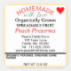 Tipografia de conserva de frutas orgânicas. O Peach Homemade é escrito em cor de pele de pêssego vermelha, com borda de cor de pêssego amarelo pálido. Frutas orgânicas. Inserir Nome e Detalhes do Contato. Ingredientes e Peso Líquido listados na parte inferior para personalizar. Pequeno coração vermelho no topo contra fundo branco nítido (deixe ou carregue sua própria imagem pequena ou exclua). Arte original e Design por TamiraZDesign.