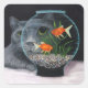 Um gato russo de cabelos longos, Cinza bonita, está olhando para uma tigela de peixe dourado redonda com um olho e rosto ampliados. O peixe-dourado parece assustado enquanto se natação acima dos muitos seixos coloridos.