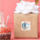 Adesivos de aniversário infantil com tema de surfe (ou selos de envelope para convites) apresentam uma grande onda em aquarela, pranchas de surfe e estrelas-do-mar na praia com tipografia "Onda Chegou" em uma fonte retrô legal. As cores tropicais (coral, amarelo, turquesa e azul-marinho) funcionam bem para menino ou menina e o nome e data podem ser personalizados. Arte por KL Stock.