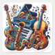 A imagem apresenta um adesivo colorido e intricadamente desenhado de diversos instrumentos musicais, incluindo guitarra, saxofone, piano e violino, com notas musicais a circular, simbolizando uma sinfonia de sons.