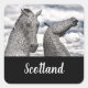 Fotografia cêntrica da escultura Kelpies em The Helix, Falkirk, Escócia. Fundo preto com sobreposição de texto branco.