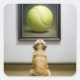 Um recuperador de ouro senta-se, encarando uma imagem que contém uma pintura de uma grande bola de tênis