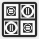 O padrão geométrico preto apresenta quatro quadrados brancos com espaço entre eles sobre fundo preto. Os quadrados grossos diagonalmente opostos contêm cada um um um círculo branco fino com um dentro de signo grosso igual. Por outro lado, os quadrados finos contêm cada um um um círculo branco espesso que toca as arestas do quadrado com um dentro de sinal fino vertical igual. Imagem criada digitalmente. Copyright © 2015 Claire E. Skinner. Todos os direitos reservados.