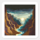 Uma bela paisagem de um canyon com um rio em tons negros de marrom, bronzeado, azul, ciano, ouro e bege.