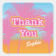 O adesivo de lembrancinha de agradecimento "Obrigado" cor-de-rosa é uma adição divertida para uma despedida de solteira com o nome da futura noiva embaixo. O fundo é colorido com palmeiras azuis, amarelas e rosas.