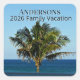 Capture a peaceful coastal moment with this sticker featuring a vivid palm tree and deep blue ocean. The open sky area includes two editable text lines where you can add your family name and vacation year or trip phrase.