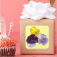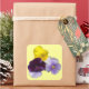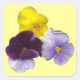 Pansias amarelas, lavandas e roxas sobre fundo amarelo pálido.