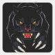 Um pano preto, posicionado centralmente na imagem, é representado em uma ilustração ousada e estilizada. O rosto e a parte superior do corpo da pantera são apresentados, com a boca aberta, revelando dentes afiados. Os olhos do animal são um amarelo impressionante, e suas garras se estendem, somando-se ao sentido de poder e agressão. O pelo da pantera é um preto profundo, contrastando fortemente com o fundo preto. Linhas fortes, definidas e sombreadas criam uma sensação de volume e textura, mostrando a forma muscular. A iluminação enfatiza as características da pantera, sem sombras visíveis, sugerindo um destaque ou estética gráfica do design. O estilo é ousado, gráfico e dinâmico, ideal para um logotipo ou poster. A composição e a perspectiva da imagem estão diretamente focadas na intensa expressão facial e na postura poderosa da pantera, criando uma impressão de ferocidade e força. Os detalhes importantes são as garras pronunciadas e a boca aberta.