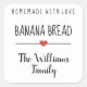 Um adesivo moderno "caseiro com amor" com "pão de banana" com uma letra preta sobre um simples fundo branco embelezado por um coração vermelho giro. Personalizar texto.