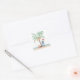 Adesivo de Natal com tema de surf (ou selos de envelope) apresenta uma palmeira (decorada com enfeites e luzes de Natal) em uma ilha tropical com uma prancha de surf, presente de Natal, estrela-do-mar e aves marinhas. Arte por KL Stock
