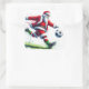 Um Papai Noel alegre, vestido com seu terno vermelho tradicional, toma um chute poderoso em uma bola de futebol em um campo verde vibrante. O pano de fundo apresenta um cenário de inverno leve, perfeito para celebrar o espírito de feriado através do esporte.