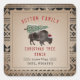 Ilustração de um bisonte de búfalo vestindo chapéu de Papai Noel com árvore de Natal amarrada às costas. burlap inspirou design de borda geométrica com texto preto e vermelho.