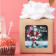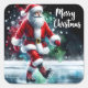 Papai Noel geme graciosamente através do gelo, vestido com seu traje vermelho clássico, de forma branca. A cena do inverno está cheia de alegria festiva, mostrando flocos de neve suavemente caindo ao seu redor enquanto celebra a alegria da temporada de festas.