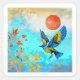 Este lindo design retrata um pássaro azul e dourado fazendo uma aterrissagem em uma árvore ouro com um belo céu de muitas cores azuis e um sol laranja ousado.
