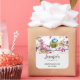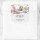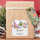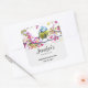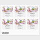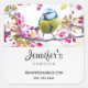 Os autocolantes de negócios com uma fotografia incrível do pássaro mais bonito empoleirado em um galho coberto de flores cor-de-rosa e folhas verdes. O pássaro tem uma cabeça azul e corpo amarelo com um rosto muito doce. Adorável.