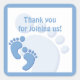 Um design gráfico de pegadas de bebês com o texto personalizável "Obrigado por se juntar a nós" em um adesivo de favor da festa. ©2014charmanepaulson