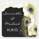 COLOR PALETTE: preto, branco, creme, ouro, mostarda, azul-aqua, azul-real, roxo e verde. COLLECTION: Combinação Guardar a data ou os selos ou adesivos do envelope do convite para o casamento. Excelente para decoração de favores com. Este conjunto de convites para casamento, estilo moderno e modesto, foi criado da trabalho de arte de cor d'água pintada manualmente projetada por Audrey Jeanne Roberts. A trabalho de arte inclui uma fita falsa na borda, curvando na página com penas originais de pavão de arte com delicados peitos de penas de giro. Do lado oposto está um conjunto de três elementos de pena de paz colocados sobre o padrão de fundo de todo o damasco. Seu texto de convite está em branco para contrastar as cores de tom de joia muito rico e é facilmente personalizado usando os campos de modelo fornecidos.