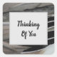 Uma foto de penas de pato enfeita este adesivo quadrado "pensando em você" criando faixas horizontais de penas. As cinzas e as penas de aves pretas acrescentam um toque de natureza e um elemento abstrato único a este adesivo barato. "Pensando em você" aparece dentro quadrado de cinza leve. Todo o texto pode ser facilmente personalizado para atender às suas necessidades. Foto original - C. McGouldrick