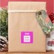 Um adesivo com uma legenda motivacional divertida, por viver a sua melhor vida. "Pense" a branco, fora da caixa, que contém as palavras "fora da caixa" a rosa profundo.