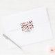 Um adesivo de endereço com uma design constituída por uma bolsa preta com bolinhas brancas, bolsas de embreagem vermelha com arco preto, rubis vermelhos, óculos de sol de gato vermelho e preto e garrafas de perfume com atomizador vermelho.