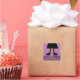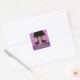 Estes adesivos divertidos do Dia das Bruxas apresentam um vestido preto de bruxa com pernas coladas em estacas listradas em laranja e preto e seus calçados pretos pontiagudos com fivelas de laranja. Fundo é um padrão de círculos roxos. O texto abaixo diz: "Feliz Dia das Bruxas!" Arte original de Anne Coffey.