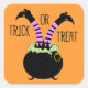 Este bonitinho e engraçado adesivo de Halloween apresenta um pote preto da bruxa borbulhante verde com pernas bruxas de cabeça para baixo no pote. O fundo é laranja e o texto no topo diz: Trick ou Tratat