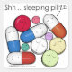 Uma imagem de um belo grupo colorido de pílulas ou medicação com rostos adormecidos. A legenda acima diz: "Shh ... babaca". Seria excelente utilizar num quarto, consultório médico, escritório de psicólogos, ou em qualquer lugar que se vendesse ou utilizasse comprimidos. Imagem engraçada criada por Christie Black of Creations do Heart.