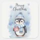 Uma ilustração encantadora de inverno de um adorável pinguim vestindo um chapéu e cachecol listrados, trazendo uma vibração acolhedora e festiva. Os flocos de neve suaves e tons azuis suaves no fundo criam uma atmosfera mágica de inverno. Perfeito para cartões de Natal, posters, adesivos e artesanatos sazonais!