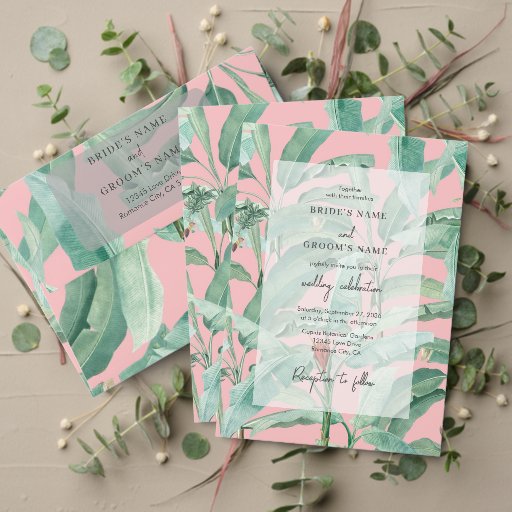 Uma banana tropical rosa deixa design de casamento. Esta design moderna contemporânea é ideal para todos os casamentos de verão e destino. Uma camada de olhar na moda vellum com a tipografia da caligrafia moderna. Uma elegante bananeira tropical elegante, palma verde-de-casamento, favor design com elementos simples modernos. Os convites de casamento e outros artigos de papelaria também estão disponíveis.