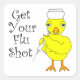 Arranje uma vacina contra a gripe em texto encaracolado com uma enfermeira de pintinho amarelo giro segurando uma agulha hipodérmica é uma design de presente engraçada com uma mensagem de saúde.