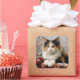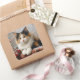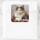 Arte adesiva quadrada com uma pintura de lindos gatos-do-cálcio numa cena de inverno rodeada por morangos vermelhos, pinhões e tecidos acolhedores.