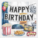 Uma ilustração em aquarela de uma festa de aniversário de noite de filme. Há um fundo branco com um bolo de aniversário e velas. Há pipocas, lanches e uma fita de filme perto do bolo. A sala tem uma cortina vermelha e uma cadeira.